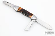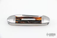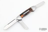 This 3-Blade Canoe by Bill Ruple features hand rub satin finished blades with nail nicks. The handle has polished stainless steel bolsters, stag covers with stainless steel escutcheon, stainless steel liners, stainless steel springs. Has half-stops, flush in all positions. Comes with a velcro case. Excellent condition.