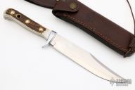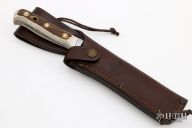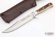 This Original Bowie by Puma features a satin finished blade with false top edge, .160" blade stock and 1.229" blade depth, full tang construction. The handle has an aluminum guard, stag scales and a lanyard hole at the butt. Comes with original box and brown leather sheath. Excellent condition.