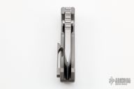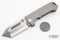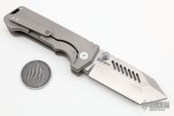 This Alpha Beast from PMP Knives features a stonewashed blade with a notched thumbrest and dual thumbstuds, .390" blade stock.  The handle features a bead blasted titanium frame with a matchig tip up pocket clip and backspacer with lanyard hole. Includes original box and challenge coin. Excellent Condition.  #008 of 280