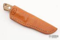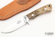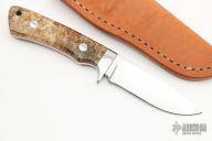 This Drop Point by James Sponaugle features a mirror polished drop point blade with .141" blade stock and 1.050" blade depth, full tapered tang construction. The handle has a stainless steel single guard with spalted maple scales over red liners. Includes brown leather sheath with belt loop. Excellent condition.