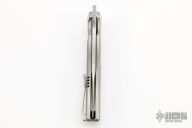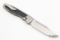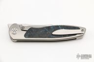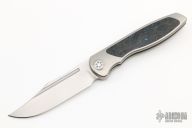 This Mini Tempest from Brian Nadeau features a hand rub satin finished bowie blade with a fuller and notched thumbrest/front flipper. The handle has a bead blasted titanium frame with Marvel Blue FatCarbon inlays, satin titanium tip up clip. Nice detent, lockup and blade seating, stainless lockface insert. Has a couple light scuffs and scratches, excellent condition otherwise.