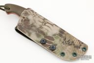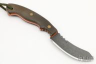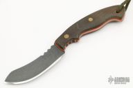This knife by Randy Lee features a tumbled blade with notched thumbrest, .047" blade stock and 1.146" blade depth, full tang construction. The handle has green canvas micarta scales with orange G-10 liners and brass pins. Lanyard tube in pommel. Includes kydex sheath with belt loop. Excellent condition.