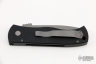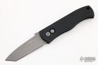 This Emerson/Pro-Tech CQC7 automatic has a chisel ground bead blast finish blade with a plain edge and a solid black aluminum handle. Bead blast stainless steel clip. Coil spring. New condition. Comes with original box and papers.