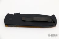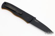 This Emerson/Pro-Tech CQC7 automatic has a chisel ground black sterile blade with a plain edge and an Ultem handle with a black push button insert.  Black stainless steel clip. Coil spring. Comes with original box and pouch. Excellent condition.