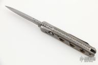 This tactical automatic from Z Custom Knives features a bead blasted drop point blade with a fileworked thumbrest. The handle features a bead blasted titanium frame with a fileworked backspring and a tip up titanium pocket clip. Scuffs/scratches are visible on the blade and handle otherwise the knife would make a good user.