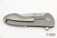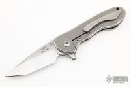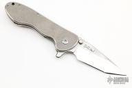 This Left Handed Fallen Star by Gillian Knives features a satin finished blade with stonewashed flats, notched thumbrest and flipper, single thumbstud. The handle has a tumbled titanium frame and tip up clip, notched titanium backspacer, CTS-XHP lockbar insert. Rides on Ceramic Salt-n-Pepper bearings, nice detent, lockup and blade seating. Comes with a zippered case and COA #63. New from maker!
