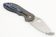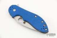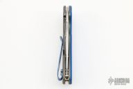 This Domino Flipper has a satin finished stainless steel drop/spear point blade with thumbhole and notched thumbrest. Handle is stonewashed titanium with A-side blue G-10 overlay, 4-way anodize finish reversible deep carry clip, and lanyard tube pin. Action is extremely responsive with great lockup. Has some light scuffs, excellent condition.