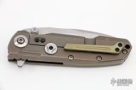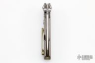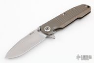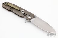 This Frame lock Flipper by District 9 has a stonewashed S35VN clip/ spear point blade with dual thumb studs, flipper, and filed thumb rest. Handle is stonewashed and anodized titanium with stainless steel lock bar insert, manual lock safe system (preventing the lock bar from sliding to the open position, making this knife a virtual fixed blade), stonewashed titanium backspacer and tip up clip, and lanyard hole. This is an impressive piece with superb ergonomics and mechanics. Flips like a champ on caged bearings, dead center blade seating and rock solid lockup. Very nice work. Excellent condition.