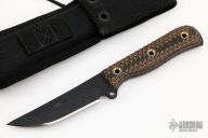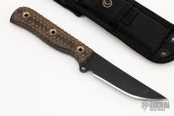 This Jungle Defender from the Busse Combat Knife Company features a black upswept blade, .198" blade stock, 1.121" blade depth. Full tang construction with canvas micarta scales. Comes with a nylon sheath. Excellent condition.