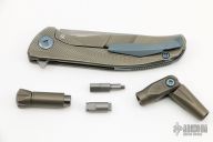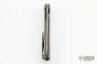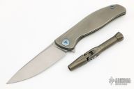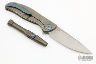 This Touch F95 by Shirogorov Knives features a stonewashed blade with a notched thumbrest and flipper. The handle has a blasted and milled titanium frame with anodized titanium backspacer and tip up clip. Nice detent, lockup and blade seating. Has MRBS. Comes with original leather case and COA #28. Excellent condition. Comes with a Shirogorov Bit Driver and a Cova Design leather pouch. Originally from the 2021 CCKS. M398 Blade Steel