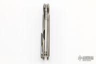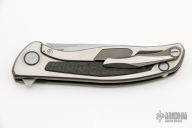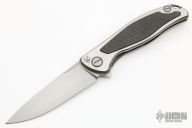 This Model 95 framelock from Shirogorov features a flat ground matte finished blade with notched thumbrest and flipper. The handle has a two-tone titanium frame with carbon fiber inlays and a matching tip up clip and a single titanium barrel spacer at the butt along with a lanyard hole. Excellent lockup, strong detent, and nice seating. Comes with original box and papers. Excellent condition.