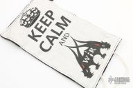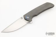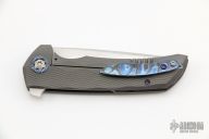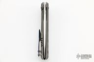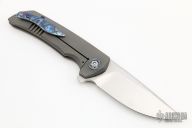 This Mini Chaos by Walter Randolph features a hand rub satin finish drop point blade with false top edge, and notched thumbrest and flipper tab. The handle has a bead blasted and milled titanium frame with Dark Ti clip and floating backspacer. Nice action, detent, and blade seating. Comes with a WR knife wrap. Has a couple very light scuffs, otherwise excellent condition.