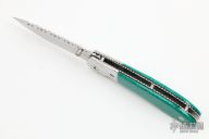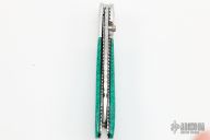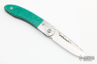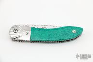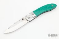 This linerlock folder by Bill Akers features a mirror polished blade with fileworked spine and single thumbstud. The handle has stainless steel bolsters, turquoise scales with black liners, fileworked stainless steel liners. Has some light scratches, otherwise excellent condition.