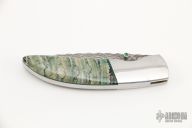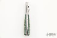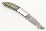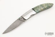 This linerlock features a San Mai Damascus blade with fileworked spine and single thumbstud with emerald inset. The handle has stainless steel bolsters, mammoth tooth scales with green liners, stainless steel liner and backspacer. Has a few light scratches, otherwise excellent condition.