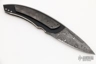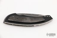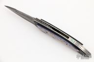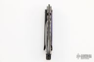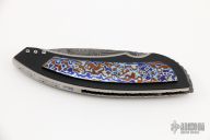 This Panerai Linerlock Flipper has a Damascus blade with fileworked spine and flipper. Handle has a Timascus scale over black G-10 and fileworked titanium liners, and fileworked titanium backspace with MOP inlay. Carbon fiber "scale", which is the clip. Great blade seating, lockup and detent with zero blade play. Comes with COA dated May 2019.