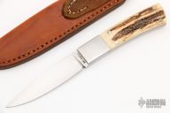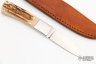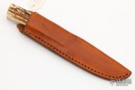 This Bird and Trout by Richard Bridwell features a hand rub satin finished blade with .114" blade stock and .757" blade depth, full tang construction. The handle has dovetailed stainless steel bolsters, stag scales and black liners. Comes  with a brown leather sheath. Excellent condition.