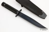 This Survival Knife by Ricardo Perpina features a blued blade with a false top edge, .196" blade stock and 1.303" blade depth, hidden tang construction. The handle has a blued steel guard and knurled hollow handle, matching blued steel butt cap. Comes with a black leather sheath with sharpening stone. New from maker.