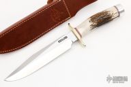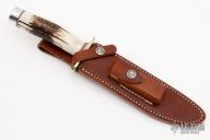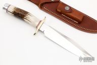 "This Randall Knives Model 1 was made famous by Allied combat troops in World War II and has since been widely used in all theaters of war." .219" blade stock. 1.308" blade depth, satin finish blade with sharpened top edge, hidden tang construction. The handle has a brass guard and duralumin butt with a stag grip and red/white/blue spacers. Includes a brown leather sheath and a zippered case. Knife is in excellent condition.