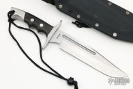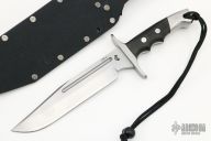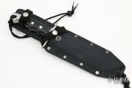This CM-5 Fighter by Independence Custom Cutlery features a matte finished blade with a false top edge and fullers, .244" blade thickness and 1.583" blade depth, full tang construction. The handle has a stainless steel guard and rear bolsters, black canvas micarta scales, lanyard hole. Comes with a kydex sheath. Has some scuffs and scratches, otherwise good condition.