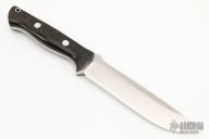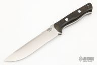 This Bravo 1.5 by Bark River Knives features a drop point blade with notched thumb ramp, .219" blade stock and 1.175" blade depth. The handle is comprised of contoured black canvas micarta scales with aluminum pins and lanyard tube over full tang construction. Exposed tang pommel with lanyard bail. Includes original box and leather sheath with belt loop. Excellent, like new condition.