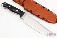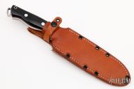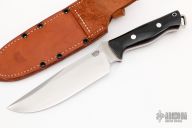 This Bravo Survivor from Bark River features a satin finished blade with notched thumbrest, full tang construction with .275" blade thickness and 1.722" blade depth. The handle has black canvas micarta scales with red liners. Comes with a leather sheath. This knife has been discontinued. Excellent Condition.