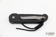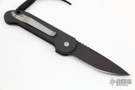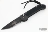 This Medium UDT from Microtech has a black, partially serrated blade. Stainless steel clip. Side opening coil-spring automatic. Dated 3/99. Blade Steel: 154-CM. Comes with original box, papers and sheath. Has a couple light marks, excellent condition otherwise.