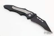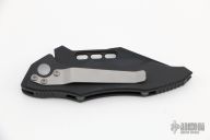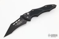 This Vector side opening automatic by Microtech Knives features a black tanto recurve blade. The handle has a black aluminum frame with green posts, tip down bead blasted stainless steel clip. Dated 12/99 and #0333. Includes original sheath, box, and paperwork. Excellent condition.