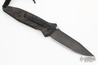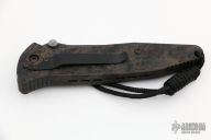 This Socom Elite M/A from Microtech has a black clip point blade with notched thumbrest and dual thumbstuds. The handle has a camo aluminum frame with rubber inlays with black stainless steel liner and tip down clip. Dated 3/99.  Comes with original box, papers, and nylon sheath. Excellent condition.