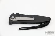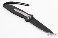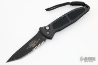 This Mini Socom Auto (3/99) has a black coated 154-CM stainless steel partially serrated blade. Handle is black aluminum with non-slip inserts, lanyard, and bead blasted titanium tip down clip. Comes with original box and papers and sheath. Excellent condition.