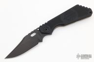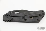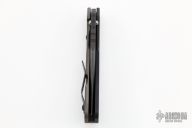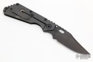 This Mick Strider SMF Bowie framelock folder features a black blade with thumbhole and notched thumbrest. The handle has a black aluminum and flamed titanium frame with titanium clip, tip up carry, lockbar stabilizer. Jimping on blade spine. Nice lockup, detent, and blade seating. New condition.