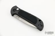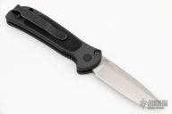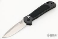 This 9750BK Mini Coalition from Benchmade features a stonewashed drop point blade with swedge. The handle is comprised of gray anodized and machined aluminum with g10 inlay and black coated stainless steel tip up clip and lanyard hole in pommel. Push button release and sliding safety. Comes with original box, papers, and drawstring pouch. Excellent condition.