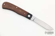 This Slipjoint by Manual Saldana features a hand rub satin finished blade with nail nick. The handle has black G-10 bolsters, brown canvas micarta covers with black G-10 liners, stainless steel spring. Has half stop, flush in all positions. Has some light scratches, otherwise good condition