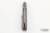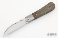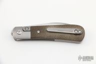 This Swayback Front Flipper by Enrique Pena features a satin finished blade with a front flipper and notched thumbrest. The handle has titanium bolsters, green canvas micarta scales with a titanium backspacer and matching tip up pocket clip. Has a couple light scuffs, otherwise excellent condition.