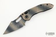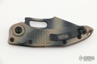 This Stitch Auto by Microtech Knives features an tan camo finished blade and false top edge, notched thumb and finger rests. The handle has a tan camo milled aluminum handle with a bronzed titanium backspacer and a black stainless steel clip, tip up carry, lanyard hole at the butt. S/N of 3554 and dated 12/2017. Excellent condition. Comes with original box and papers.