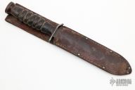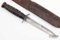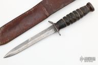 This M3 from Camillus Knives features a black bayonet ground blade with sharpened top edge, .177" blade stock and .882" blade depth, hidden tang construction. The handle has a steel guard and butt, and a stacked leather grip. Comes with a brown leather scabbard with belt loop. This vintage knife has been used, carried and resharpened, otherwise in good condition for its age. If this thing could talk...