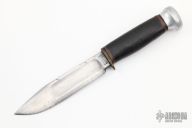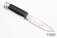 This Hunter by Marbles was made in Gladstone Michigan. It features a satin finished blade with fullers, .171" blade stock, 1" blade depth, hidden tang construction. The handle has a brass guard, stacked leather grip, aluminum pommel, black/brass/red spacers. Has some pitting and scratches, otherwise good condition for its age.