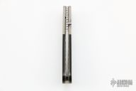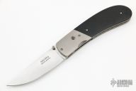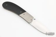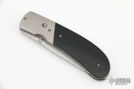 This Gent's Liner lock by AW Paulsen features a hand rub satin finished blade with single thumbstud and fileworked thumbrest. The handle has bead blasted titanium bolsters and backspacer, black wood scales, button with black lip pearl inlay, anodized and fileworked titanium liners. Nice detent, lockup and blade seating. Has some light scuffs and scratches, otherwise good condition. This knife is a liner lock, but the lock is disengaged with the button. Comes with a zippered case.