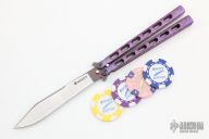 This Highroller by Mike Snody features a hand ground, satin finish clip point blade with swedge. The handles are integral billet titanium channel handles that were anodized. Very smooth flipping. Excellent Condition.