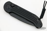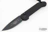This LUDT side opening automatic by Microtech has a black blade with a standard edge and a black aluminum frame. This tactical version has black fittings. Stainless steel clip. Dated 11/2022 and serial number 28901. Comes with original box and sheath. Excellent condition.