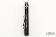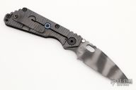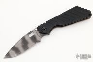 This Mick Strider SNG Fatty framelock folder features a tiger striped blade with thumbhole and notched thumbrest. The handle has a black aluminum and flamed titanium frame with titanium clip, tip up carry.  Gray Precision Blue line lockbar stabilizer. Jimping on blade spine. Nice lockup, detent, and blade seating. Has some scuffs, otherwise good condition.