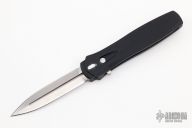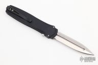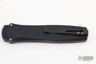 This is a Dark Angel single action out the front auto by Pro-Tech Knives features a satin finished double edged blade and black anodized aluminum handle. Black stainless steel clip. Safety switch. Production run #3 s/n 2. Comes with original sheath and box. Has scuffs and scratches, good condition otherwise.