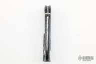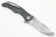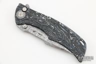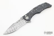 This Tighe Down Button Lock Flipper by Brian Tighe features a Damasteel multi-ground blade with notched thumbrest, flipper and dual thumbstuds. The handle has an integral fat carbon frame with a tip up Damasteel clip with ceramic ball inlay and pivot collars. Comes with a zippered case. Excellent condition.