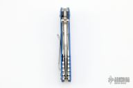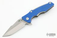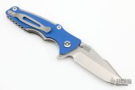 This Eklipse Tri-Way by Hinderer Knives features a stonewashed harpoon spanto blade with dual thumbstuds, flipper and notched thumbrest. The handle has a tumbled titanium frame and liner with a textured blue G-10 scale and tumbled titanium clip and hardware. Nice detent, lockup and blade seating. Comes with original box, card and extra hardware. Excellent condition.