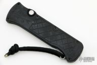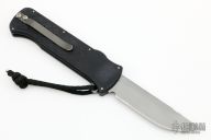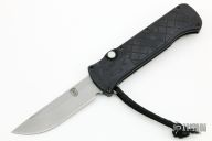 This OTF automatic by Rob Dalton features a bronzed and bead blast blade and black milled aluminum handle. Titanium clip. Fires via push button and retracts by holding the button and moving the slider on the side of the knife. Has light scratches and scuffs, otherwise good condition. F00606