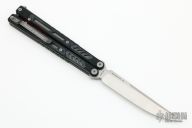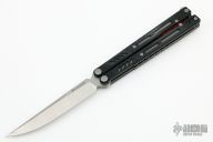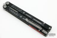 This Balisong by Maxace Knives features a satin finished 14C28N blade with false top edge. The handle has black G-10 scales, , titanium liners , red aluminum  spacers, tip up stainless steel clip and T-latch. Comes with original zippered case and trainer blade and extra hardware. New from maker.