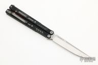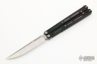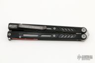 This Balisong by Maxace Knives features a satin finished 14C28N blade with false top edge. The handle has black G-10 scales, , titanium liners , red aluminum  spacers, tip up stainless steel clip and T-latch. Comes with original zippered case and trainer blade and extra hardware. New from maker.