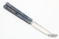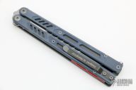 This Balisong by Maxace Knives features a satin finished 14C28N blade with false top edge. The handle has blue G-10 scales, , titanium liners , red aluminum  spacers, tip up stainless steel clip and T-latch. Comes with original zippered case and trainer blade and extra hardware. New from maker.