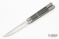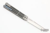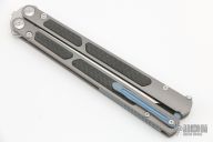 This Balisong by Maxace Knives features a satin finished clip point blade with false top edge. The handle has blasted titanium handles with carbon fiber inlays, anodized titanium backspacers, tip up clip and T-latch. Comes with original box, zippered case with trainer blade and extra hardware. New from maker.