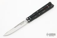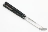 This Balisong by Maxace Knives features a satin finished 14C28N blade with false top edge. The handle has black G-10 scales, titanium liners , red aluminum  spacers, tip up stainless steel clip and T-latch. Comes with original box and trainer blade. New from maker.
