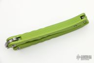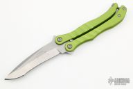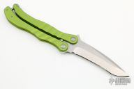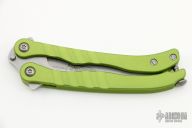 This Metalmark Balisong by Microtech features a stonewash finished blade. The handles are green aluminum with blasted SS T-latch. #01345 and 03/2013. Excellent condition.